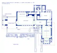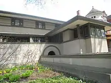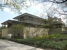 The Frank W. Thomas House is a historic house located at 210 Forest Avenue in the Chicago suburb of Oak Park, Illinois, United States. The building was designed by architect Frank Lloyd Wright in 1901 and cast in the Wright-developed Prairie School of Architecture. By Wright's own definition, this was the first of the Prairie houses - the rooms are elevated, and there is no basement. The house also includes many of the features which became associated with the style, such as a low roof with broad overhangs, casement windows, built-in shelves and cabinets, ornate leaded glass windows and central hearths/fireplaces. Tallmadge & Watson, a Chicago firm that became part of the Prairie School of Architects, added an addition to the rear of the house in 1923.[2]