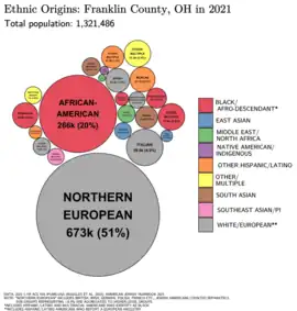 Franklin County is a county in the U.S. state of Ohio. As of the 2020 census, the population was 1,323,807,[3] making it the most populous county in Ohio. Most of its land area is taken up by its county seat, Columbus,[4] the state capital and most populous city in Ohio. The county was established on April 30, 1803, less than two months after Ohio became a state, and was named after Benjamin Franklin.[5] Originally, Franklin County extended north to Lake Erie before it was subdivided into smaller counties. Franklin County is the central county of the Columbus, Ohio Metropolitan Statistical Area.