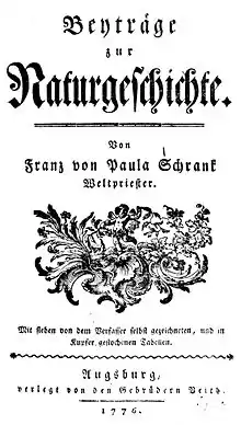 He was ordained as a priest in Vienna in 1784, gaining his doctorate in theology two years later. In 1786 he was named chair of mathematics and physics at the lyceum in Amberg, and in 1784 became a professor of botany and zoology at the University of Ingolstadt (later removed to Landshut).[1] Schrank was the first director of the botanical gardens in Munich from 1809 to 1832.