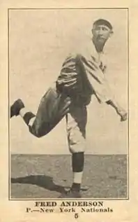 John Frederick Anderson (December 11, 1885 – November 8, 1957) was an American baseball player. He played for Davidson College in 1906, but later transferred to the Maryland Agricultural College (later the University of Maryland), where he played from 1907 to 1909. Then, the 6 ft 2 in (1.88 m), 180-pound pitcher moved to play for the Boston Red Sox. Anderson played in Boston in 1909 but did not play major league baseball again for the Red Sox again until due to his practicing dentistry.[1] In 1914, he jumped to the Federal League to play for Buffalo for the 1914 and 1915 seasons.