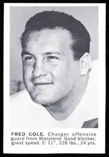 Frederick Michael Cole (June 14, 1937 – October 11, 2013) was a Canadian football player who played for the Winnipeg Blue Bombers. He won the Grey Cup with them in 1959.[2] He played college football with the University of Maryland Terrapins. Cole was also drafted in the 1959 NFL draft by the Chicago Bears (Round 6, #68 overall). After playing with Winnipeg, he also played a single season with the Los Angeles Chargers of the American Football League (AFL). He died in his native state of New Jersey in 2013.[3]