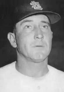 Hutchinson won The Sporting News Manager of the Year Award, and his popularity in the Mound City resulted in a new nickname, "The Big Bear", bestowed by Cardinal broadcaster Joe Garagiola. Hutchinson's typical unsmiling expression also led Garagiola to joke that Hutchinson was "a happy guy inside, only his face didn't show it."[21] He was given a raise in his one-year contract for the next season.[20] However, Lane's departure from the front office and the Cardinals' disappointing season resulted in Hutchinson's dismissal;[22] it came on September 17, with the team six games below .500 and in fifth place.[23] Lane's successor, Bing Devine, strongly recommended retaining Hutchinson, but he was overruled by the Cardinals' owner, August A. Busch Jr.[24]