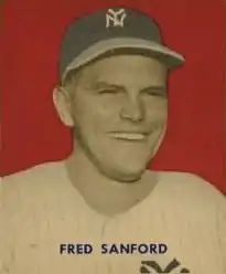 Sanford's name came up in trade rumors early in the 1950 season, as the Yankees were in need of left-handed pitching.[5] He responded to these rumors by getting off to a 4–0 start; shortly after which, the Yankees acquired left hander Joe Ostrowski from the Browns without departing with Sanford.[6] From that point forward, Sanford's record fell to 1–4 with a 5.40 ERA. Having been a starter in the early part of the season, Sanford was demoted to the bullpen in June, making just one spot start in August. The Yankees returned to the World Series in 1950, however, Sanford was once again kept out of all four games with the Philadelphia Phillies. The Yankees won the World Series both seasons Sanford was with the club, but he did not make a postseason appearance.