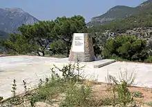 An inscription was placed close to the point of Frederick's demise by the Embassy of Federal Republic of Germany in 1971.[1] However, when the highway was widened by the General Directorate of Highways, a larger monument with a larger than life statue of the emperor was inaugurated at the present place on 11 May 2012.[2][3] The new location was determined by the German ambassador Prof. Pascal Hector. The bilingual (German and Turkish) inscription is identical to that of 1971 and reads: