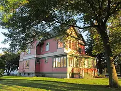 The Squire House is located north of downtown Bennington, at the southeast corner of North Street (United States Route 7) and Gage Street. It is a 2+12-story wood-frame structure, with a cross-gabled roof, an exterior clad in clapboards and decoratively cut shingles, and a foundation of brick, stone, and concrete. It has a projecting front porch, now enclosed in glass, extending across the front, with a smaller second-story porch above. A band of cut shingles extends around the building between the first and second floors, with more such shingling in the gables above the second-floor windows. Small oval keystoned windows make decorative accents on the side facades. The interior retains original high-quality woodwork, including the staircase, builtin cabinetry, and spindlework transom screens on some of the windows. The dining room has a pressed metal ceiling.[2]