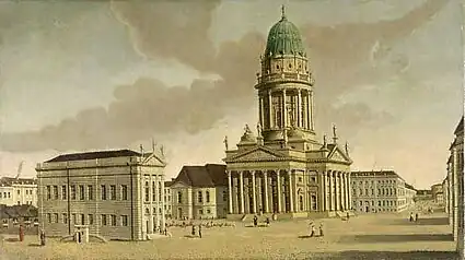 Frederick William was a passionate supporter of the arts. Upon ascending to the throne Frederick William turned the cultural focus of the country away from the French culture that Frederick II had established. For instance, the French Theatre was transformed into the National Theater on Gendarmenmarkt where performances of German opera and plays were performed. During its opening, Frederick William declared, "We are Germans, and we intend to remain so."[14] The Royal Opera played works by Johann Frederick Reichardt and Wolfgang Amadeus Mozart. Berlin developed into a cultural center of the Classical era, competing with Paris, Dresden, and Vienna. The king himself was a passionate cellist. When government affairs allowed, he spent about 2 hours daily with the instrument.[12] With 70 permanently employed musicians, the king's court orchestra was considered one of the largest in Europe.[15]