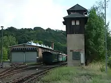 The resulting high traffic density on the railway congested and delayed traffic. The situation was further intensified with the start-up of the tramway through the Plauenscher Grund (the valley of the Weißeritz between Plauen and Freital) in 1902. The exit from Potschappel towards Dresden created a chokepoint, which could only be eased by the raising of the railway from 1905 to 1909.[5] As a result of the upgrading, reconstruction work was also carried out at the entrance building erected in 1855. The railway was upgraded to four tracks, with work completed in 1914, allowing passenger and goods traffic to be handled separately at Potschappel station. During this time, signal box B1 was built, which is still preserved one and under heritage protection.[6]