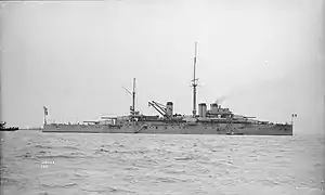 Courbet was ordered on 11 August 1910[8] and named after Admiral Amédée Courbet.[9] She was laid down on 1 September 1910 at the Arsenal de Lorient and launched on 23 September 1911. Shortly after finishing her machinery trials, she ferried the President of France, Raymond Poincaré, to Britain for a short visit on 24–26 June 1913. Courbet was completed on 8 October at a cost of F57,700,000 and was commissioned into the fleet on 19 November. Courbet and her sister Jean Bart were assigned to the 1st Battle Division (1ère Division de ligne) of the 1st Battle Squadron (1ère Escadre de ligne) of the 1st Naval Army (1ère Armée Navale), at Toulon in mid-November and Courbet became the flagship of Vice-Admiral (Vice-amiral) Augustin Boué de Lapeyrère, commander of the 1st Battle Squadron, on 5 January 1914.[10]