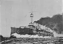 After returning to France, the ship's mainmast was removed to allow her to tow a balloon and anti-aircraft guns were installed on the roofs of the after 164 mm gun turrets.[6] Ernest Renan finished her active career as a gunnery training ship from 1927 to 1929, after which she was stricken from the naval register.[13] During her tenure in the gunnery school, she was commanded by Émile Muselier, who went on to serve as the commander of the Free French Naval Forces during World War II.[14] In 1931, the old cruiser was expended as a target ship for aircraft and naval gunners.[6][Note 3]