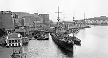 The composition of the Mediterranean Fleet changed little in 1896, apart from the addition of the new pre-dreadnought battleship Brennus.[22] That year's maneuvers lasted from 6 to 30 July and took place off the coast of French Algeria.[23] By 1897, Dévastation had been reduced to the Reserve Squadron of the French fleet, which also included the ironclad Caïman, Terrible, Amiral Duperré, and Friedland.[24] She remained in the Reserve Squadron in 1898, by which time the French Navy had begun rebuilding several of its older ironclads. As a result, the only other members of the unit were Indomptable and Amiral Duperré.[25] She took part in the fleet maneuvers that year, which lasted from 5 to 25 July. She served as the flagship of Rear Admiral Godin during the maneuvers.[26] In December, the ship had her mainmast removed at Brest.[27]