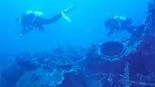 Divers on the wreck of Ariane with the engine compartment hatch open