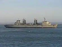 Durance was equipped with two landing craft for vehicles and personnel.[3] The ship has two dual solid/liquid underway transfer stations per side and can replenish two ships per side and one astern.[4] As built, Durance had capacity for 7,600 t (7,500 long tons) of fuel oil, 1,500 t (1,500 long tons) of diesel oil, 510 t (500 long tons) of JP-5 aviation fuel, 130 t (130 long tons) of distilled water, 170 t (170 long tons) of provisions, 150 t (150 long tons) of munitions and 51 t (50 long tons) of spare parts.[2]