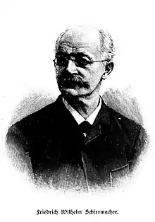 Friedrich Wilhelm Schirrmacher (28 April 1824 in Danzig – 19 June 1904 in Rostock) was a German historian. He is best known for the discovery of the original files and protocols of the Marburg Colloquy.[1] The original texts are reprinted until today.