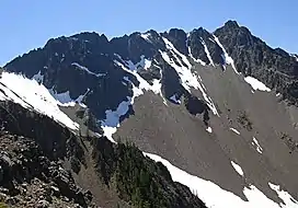 Frosty Mountain is a 2,426-metre (7,959-foot) mountain summit located in the Canadian Cascades of southwestern British Columbia, Canada. It is situated 4 km (2 mi) south of Lightning Lake, 1.3 km (1 mi) north of the Canada–United States border, and 3.6 km (2 mi) north-northeast of Castle Peak, which is its nearest higher peak. Frosty Mountain is the highest peak in E. C. Manning Provincial Park, and is part of the Hozameen Range which is a subrange of the Cascade Range.[2] It has a lower elevation subsidiary peak known as Frosty Mountain East (2409 m) which is labelled as Frosty Mountain on some maps.[3] The Frosty Mountain name was officially adopted on March 31, 1924, by the Geographical Names Board of Canada.[4][5] The peak was first climbed on September 2, 1904, by Sledge Tatum and George Loudon Jr., two members of a Boundary Survey group led by Edward C. Barnard.[1] Precipitation runoff from the peak drains into headwaters of Frosty Creek, as well as other tributaries of the Similkameen River.