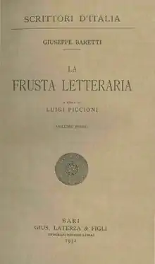 - Giuseppe Baretti, La Frusta Letteraria, edited by Luigi Piccioni, Laterza, Bari 1932, voll. I and II