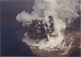 The earliest recorded eruption of Fukutoku-Okanoba in 1904 formed an ephemeral island named Shin-Iwo-jima (New Sulfur Island). Other ephemeral islands have also formed, the most recent of which formed in 1986.[3] In 2010, the Japanese coast guard spotted steam rising one kilometer (0.62 mi) above the ocean and water discoloration of the surrounding area.[1] In 2021, the Japan Meteorological Agency (JMA) reported that a submarine eruption occurred at Fukutoku-Okanoba volcano at 6:20 a.m. local time on August 13.[4] On August 16, it was confirmed that a new island had formed as a result of the latest eruption.[5]