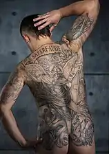A body suit or full body suit is an extensive tattoo, usually of a similar pattern, style or theme that covers the entire torso or the entire body.[1] They are associated with traditional Japanese tattooing as well as with some freak show and circus performers.[2] Such suits are of significant cultural meaning in some traditional cultures, representing a rite of passage, marriage or a social designation.