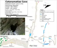 The Furnia de Catanamatias, also known as El Respiradero del Diablo, is the deepest cave in Dominican Republic, located near Las Matas de Farfán, San Juan, in the Sierra de Neiba mountain range. The cave was discovered in 1988 by a group of Italian cavers who wrote that they explored it to a depth of 380 meters.[1][2] A later expedition in 2023 by cavers from USA, Mexico and Costa Rica explored the cave down to 195m and stopped due to unbreathable air with high CO2 level.[3] The cave floods significantly during the wet season, and as a result the passages are often muddy, featureless, filled with mud and decomposing organic matter, which causes dangers such as unbreathable air and leptospirosis. Future expeditions to Catanamatias will need failproof respirator technology to continue exploration into regions of the cave with unbreathable air. [4]