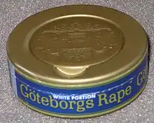 Göteborgs Rapé (Swedish pronunciation: [jœtɛˈbɔrjs raˈpeː]; transl."Gothenburg's grated/shredded") is a popular brand of Swedish snus – a pasteurized smokeless tobacco product. Its original recipe was created in Gothenburg during the early 19th century.