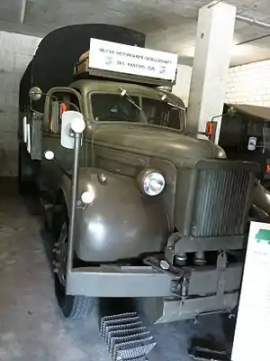 The GMC AC 454 is a military truck build by the General Motors Company in the USA. It was used in World War II. The truck has a bridge construction. It has an onboard voltage of 12 volts. In the Swiss army the GMC AC 454 received the designation Lastw. Gl 3.5T 4x2 (off-road truck with 3.5t payload). The Swiss army used about 90 of these trucks. In 1971 a few GMC AC 454 were rebuilt by Pius Lang from the "Military-Motorfahrer-Gesellschaft des Kantons Zug" with Wood gas generator. The Wood gas generators were mounted on civilian trucks during the Second World War. Such a rebuilt GMC AC 454 is now located in the Zuger Depot Technikgeschichte (Zug depot of technical history).