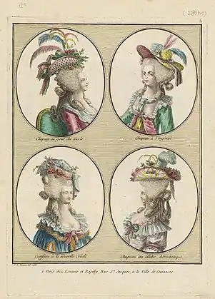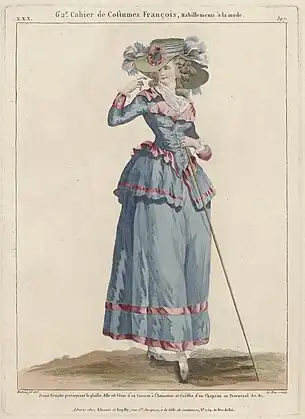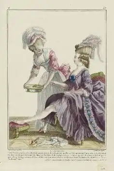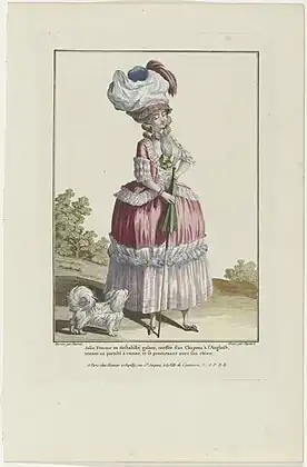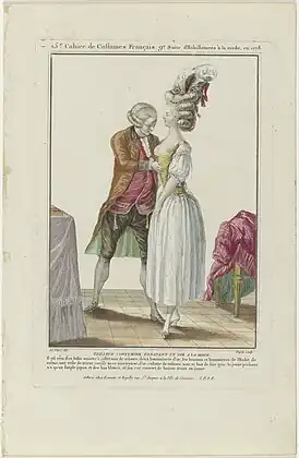 Galerie des modes was conceived during the final decades of the 1700s, a period when France was at the forefront of fashion innovation. To quote the historian James Laver, at this time "fashionable clothes...meant French clothes."[2] This supreme influence was undoubtedly strengthened by Queen Marie Antoinette as well as figures such as Rose Bertin (her dressmaker) and Monsieur Léonard Autié (her hairdresser) who were responsible for designing her iconic courtly wardrobe.[3] Beginning in the 1770s (the decade during which Antoinette both married future king Louis-Auguste and assumed the title Queen of France and Navarre), women's dress came to exhibit greater variation than ever before; the fashion plate emerged under these conditions, as if to disseminate each budding trend.