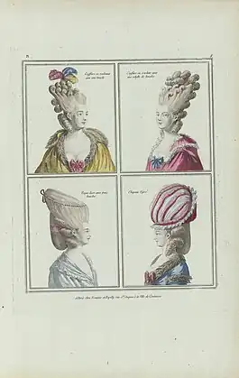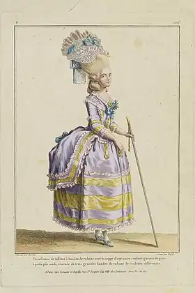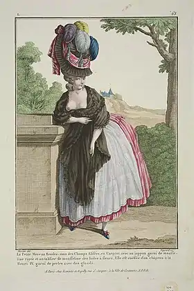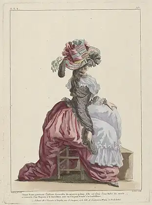 Perhaps in an effort to emulate the prints of The Lady's Magazine, various engravers, hairdressers, and booksellers had, at this time, published a number of small almanacs on contemporary fashion. In formulating their Galerie, Esnauts and Rapilly combined the subjects of these early volumes (which primarily focused on hairstyles) with the high quality of engraving found in series by the prolific Moreau le Jeune, such as Suite d'estampes pour servir à l'Histoire des Moeurs et du Costume.[6] The resulting prints were distributed at random intervals, usually in sets (cahiers) of six, for the price of 36 livres (around 14 euro's in today's currency). Although many historians differ on the exact number of plates issued throughout publication, it is clear that over 400 engravings were issued in what was probably more than 70 portfolios. The first cahiers focused solely on hairstyles (coiffures) However, from the seventh cahier onwards, the series began to represent full outfits, illustrated from head-to-toe. The first collected volume of the Galerie (published in 1779) included 96 plates which came from the initial 16 portfolios of the series and was preceded by a forty-page descriptive introduction written by the lawyer G.François-Roger Molé.[7]