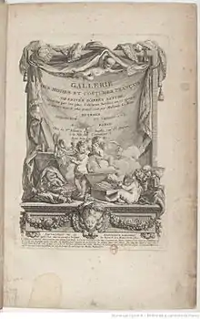 Although there exist no contracts that officially confirm the involvement of these artists, their respective contributions are marked by signatures.[9] With the exception of the first six notebooks (which are not signed) as well as a few other plates which seem to have been released later in publication, the names of the designer and the engraver are found below each image included in the Galerie, often with variations in spelling. The name of the designer normally appears at the lower right of each plate, alongside the words "Dessiné par" or "del." ("delineavit"). The name of the engraver, meanwhile, is typically found on the lower right beside the terms "Gravé par" (or "Gravée par), "sc." or "sculp." ("sculpsit").[10] In certain rarer cases, the designer's name is accompanied by the word "inv." ("invenit"), meaning "invented it" or "devised it." This notation can often be viewed, for example, alongside the signature of Jean-Baptiste Martin and seems to have been used for the first time in the twenty-fourth cahier of the series.