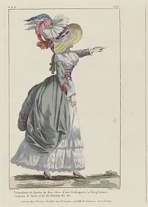 Galerie des Modes et Costumes Français is a series of fashion and costume plates that was distributed in Paris from 1778 to 1787, during the reign of King Louis XVI of France and Marie Antoinette. The first collected volume, which was produced in 1779, had a title page which bore an allegorical illustration as well as the full title of the collection: Gallerie des modes et des costumes français dessinés d'après nature, Gravés par le plus Célèbres Artistes en ce genre, et colorés avec le plus grand soin par Madame Le Beau. Ouvrage commence en l'année 1778. A Paris, chez le Srs Esnauts et Rapilly rue St. Jacques à la Ville de coutances. Avec priv. Du Roi (Gallery of French fashions and costumes, drawn from life, engraved by the most celebrated artists in this medium, and hand-colored with the greatest care by Madame Le Beau;publication begun in 1778. Paris, Messrs. Esnauts and Rapilly, rue Satin-Jacques, at the sign of the City of Countances. Licensed by the King). Importantly, this lengthier epithet indicates that the engravings of the Galerie (or Gallerie, according to eighteenth-century spelling) were created "d'après nature," or "after nature," meaning that they were intended to represent what was actually worn in the streets of Paris during the latter part of the eighteenth century.