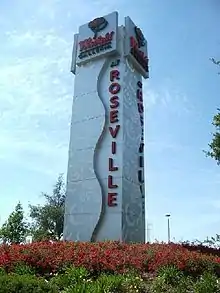 Stele signage at the corner of Galleria Boulevard and Roseville Parkway, a major intersection adjacent to the mall.