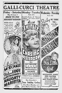 An advertisement for movies showing at the Galli-Curci Theatre in late May and early June 1935