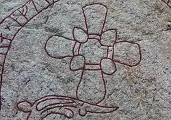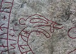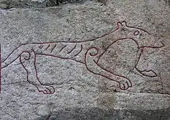 The right carving Sö 313 is purely ornamental and probably represents a wolf. The lean wolf with hanging tongue seems to quickly rush out of the picture. The carving also includes a couple of ordinary rune snakes and a braided ring cross. The depicted cross means that Holmfast's family were Christian, which is further supported by the content of the text. [1]