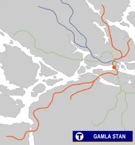 Gamla stan is a station on the Green and Red lines of the Stockholm metro. It is located on the western side of the Gamla stan (Old town) district of central Stockholm, and is at ground level, although partly under the Centralbron bridge that carries road and mainline rail across the waterways that define the centre of the city. The same waterways are responsible for the ground level location of the station, unusual for a city centre metro station, as the lines cross between the islands of Stadsholmen and Södermalm by a bridge immediately south of the station.[2][3]