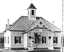 The design was originally meant to be a two-room, two-story schoolhouse, but was eventually reconfigured to be a two-room, one-story building, with classrooms located side-by-side. The main building measures about 53.5 by 29 feet (16.3 by 8.8 m). Each of the two classrooms is rectangular; they were originally separated by a sliding wall, which could be moved in the event of a large crowd or gathering. A vestibule used as a cloakroom juts out from the front about 8 feet (2.4 m); each classroom had its own entrance, which can still be seen in the photo shown above.[1]