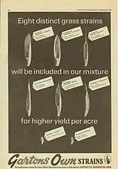 In 1965 Peter Darlington[38] became chairman of Gartons Limited. In a dramatic change of direction in 1967 Gartons Limited ceased retailing seeds directly to farmers. Instead a new brand was created, Gartons GROplan, and marketing became wholesale through agricultural merchants throughout the United Kingdom.