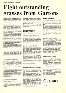 Generous publicity followed in the press, together with the publication of articles by botanists in the Journal of the Royal Agricultural Society of England, and in the Transactions of the Royal Highland and Agricultural Society of Scotland in 1894 and 1898.[5] Professor Robert Wallace (1853–1939) of the University of Edinburgh said 'Under the system originated by Mr John Garton an infinite number of new and distinct breeds of oats, barleys, wheats, clovers and grasses have been produced'.[6]