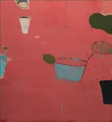 Komarin is indebted to the New York School, especially his mentor Philip Guston with whom he studied at Boston University.[1] According to a New York Times article by Barry Schwabsky, “Guston's lesson in cultivating the unknown has clearly stuck with Mr. Komarin. And on a more superficial level, the teacher's peculiar sense of form can also still be traced in his former student's work – in the way Mr. Komarin's bulbous forms can seem to echo, in an abstract way, the cigars, cyclopean heads and naked light bulbs in Guston's paintings.”[2]