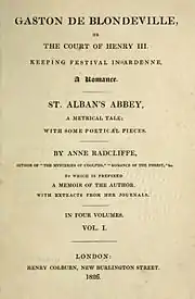 - ↑ Radcliffe, Ann Ward (17 April 2006). Chiu, Frances (ed.). Gaston de Blondeville. Valancourt Books. ISBN 097778410X.