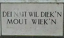 Keystone on the Waterschapshuis in Onderdendam; "Dei nait wil diek'n mout wiek'n", which loosely translated means "Whoever doesn't want to build a dike has to yield."