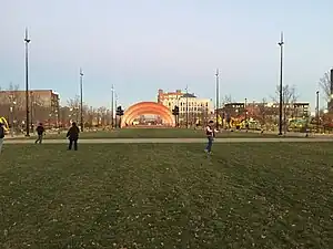 Gene Leahy Mall, also known locally as Central Park or The Mall, is a 9.6-acre (39,000 m2) park located at 1302 Farnam on the Mall in Downtown Omaha, Nebraska, U.S.A., and bordered by South 10th Street. There are also two huge slides, a sculpture garden, a remote-control boat cove, a large children's play area, and an amphitheater where outdoor concerts are held in the summer. The mall is decorated with thousands of lights during the winter holiday season.[1][2] Connected on its eastern edge with the Heartland of America Park, it is also borders the former site of the W. Dale Clark Library (demolished in fall 2022), the former Burlington Headquarters Building, the Old Market and the ConAgra campus.
