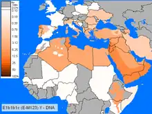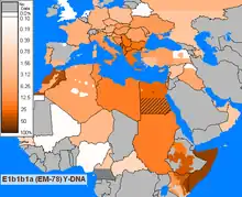 Distribution density of E1b1b1a (E-M78) in select areas of Africa and Eurasia.