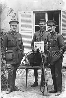 - ↑ Although this photograph is not dated, the pristine appearance of the captured German equipment suggests it comes from the first weeks of the war: it was quickly discovered by both sides that the glint of sunlight on the highly polished metal beloved of sergeant-majors everywhere soon attracted the unwanted attentions of enemy artillery.