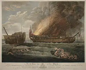 Carter's dramatic portrayal of contemporary events such as the death of Captain James Cook was greatly influenced by Copley.[3] Frederick Peter Seguier noticed what he called a "slight resemblance between George Carter's pictures of the siege of Gibraltar and some of the historical pictures of Zoffany", adding that "Carter's figures viewed as portraits are very good."[4] The artist had visited Gibraltar in August 1784 to make portraits of the British officers involved in the action.[5]