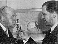 George Davis has his cigarette lit by Harold Holt using a burning piece of Glen Davis oil shale in 1939.[23] Note the headband securing his hearing aid.