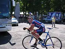 Hincapie has several important wins of his own, starting with Gent–Wevelgem in 2001 and Kuurne–Brussels–Kuurne in 2005. Also in 2005, Hincapie took two stage wins at the Critérium du Dauphiné and 2nd place at Paris–Roubaix. In 2005 he had his first stage win in the Tour de France where, on July 17, he finished seven seconds ahead of climber Óscar Pereiro to win Stage 15 from Lézat-sur-Lèze to Pla d'Adet. In January 2014, Pereiro acknowledged in a radio show that during the final climb, Hincapie turned his head and said 50,000, which Pereiro assumed was in Euros, although Hincapie was referring to U.S. dollars. Pereiro accepted the offer and sold the stage to Hincapie.[7] The deal was closed some kilometers before arriving to the finish line.[8] More recent victories include two stages at the Tour of California (2006), the overall and a stage at the Tour of Missouri (2007), and another stage win at the Critérium du Dauphiné in 2008. He is a three-time US Professional Road Race champion (1998, 2006, 2009).