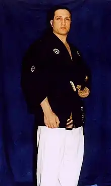 At the Great Falls Bukokan, Thanos started his studies in Kenjusu, the art of wielding the Japanese sword in 1991. Master Ki Whang Kim awarded Thanos a 7th degree Black Belt in Tae Kwon Do in 1992. In the course of his pursuit of Kenjusu studies, Thanos received a Kyosei (Black Belt) from Sensei Fredirick Lovert. In 1998, Thanos opened a dojo (training studio) in Rockville, MD which specialized in Tae Kwon Do, Kenjusu and Aikido. At the Living Legends Award Ceremony in Washington, D.C. in 1999, Thanos received a special award and the recognition from Robert E. Everhart.[13] Thanos and Mitchell Bobrow, both of whom started their martial arts careers at the studio of legendary trainer Master Ki Whang Kim, are the only two students of Kim to be awarded the highest ranked of 7th degree Black Belt by the Grand Master Kim. In 2009, Thanos was inducted into the Tae Kwan Do Hall of Fame and celebrated for his "reliance on not any one style of attack in his arsenal but an array of sweeps, punches, round and back kicks while integrating them into a continuous fury."[14]