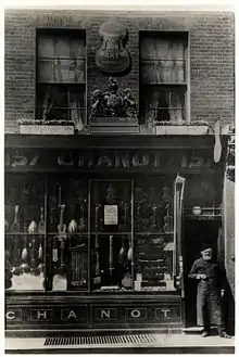 Georges Chanot III in the doorway of his shop in Wardour Street in the 1880s
