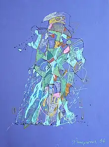 2. Notes and References, p. 41, note 8, in "Georgeta Naparus" by Radu Bogdan, it is mentioned that "Legend" is painted on top of another painting, "In the parents' house", a painting exhibited in Belgrade and Zagreb in 1966, that had vague influences from Marc Chagall. "