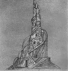 Simultaneously and in parallel with theatrical and decorative creativity, Yakulov was able to step into the design and construction (architectural) sphere: in 1922 on the instructions of the head of the Sportintern N. Podvoisky, he participated in the preparation of the "Red Stadium" project in Luzhniki,[83] in 1923–1924, in collaboration with V. Schuko, he created a project of a monument to 26 Baku commissars.[84][85] Yakulov considered the design of the "26 monument" to be his major work: "This work completes a cycle of works throughout my entire artistic activity to create a work of heroic pathos".[86]