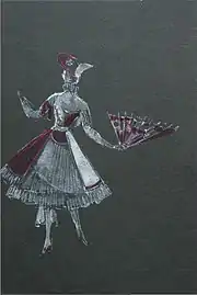 Carnival eccentricity of the Yakulov theater performances, who showed herself two years earlier in "Princess Brambill" and which seemed to the audience a cascade of impromptu, was strictly organized by the artist: this is evidenced by the preparatory sketches with the consistent development of mise-en-scenes and all the details of the spatial composition.[141] The same careful study of many details distinguished Yakulov's preparation of the scenography of the ballet "Steel Skok" - all his drawings were accompanied by detailed verbal explanations of the nature of the interactions of the dynamics of movements of ballet dancers with the kinetics of the moving parts of the scenery,[145] schematic indications of sources and directions of complex lighting scores and so on. "Steel Skok" was created in collaboration with the composer Prokofiev, whose music was written "simultaneously with Yakulov's script - by scenes, by episodes", and for the first time in the history of Diaghilev's" Russian ballets "the script prescribed" literally in seconds, not only the development of the plot, but also the nature of the movements and the number of characters".[146]