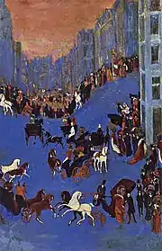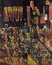 In addition to early decorative compositions that transformed visual images of the East in Western figurative forms ("Roosters", "Decorative Motif") and a series of paintings from the mid-1910s, embodying in practice the Yakulov theory of "multi-colored suns" ("Spring Walk", "Fantasy", "Bar" - all 1915), the cross-cutting themes of different years in Yakulov's painting were urbanism[2] and the atmosphere of public entertainment: crowd in urban and suburban landscapes or in confined spaces of bars and cafes, masquerade, fairgrounds, characters from the Italian commedia dell'arte.[138] These motives were developed by the artist in numerous versions of "Cafe", "Horse Racing", "Streets" and in individual works: "Tverskaya", "Circus", "Monte Carlo" and so on. The ironic perception of reality was mixed in these works of Yakulov with his stormy and fabulous fantasy, but sometimes it turned into a dark expression - both in the years of late modernity and in new, "constructivist" times, and took out of the modern Soviet artistic context such works of Yakulov, as the phantasmagoric painting "The Man of the Crowd" (1922; first version - 1907).[139]